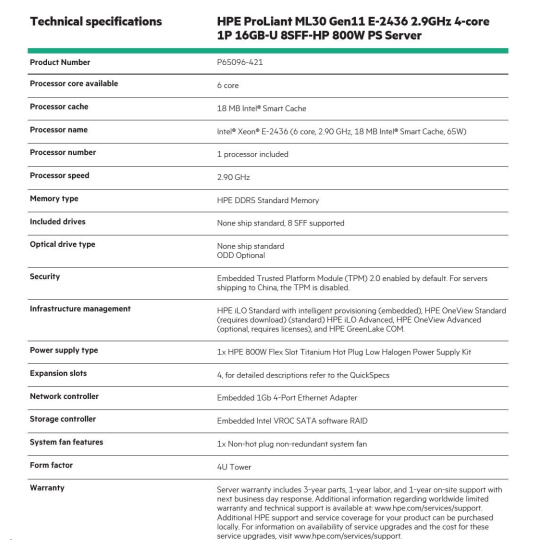 Technical specifications HPE ProLiant ML30 Gen11 E-2436 2.9GHz 4-core 1P 16GB-U 8SFF-HP 800W PS Server