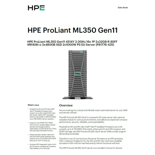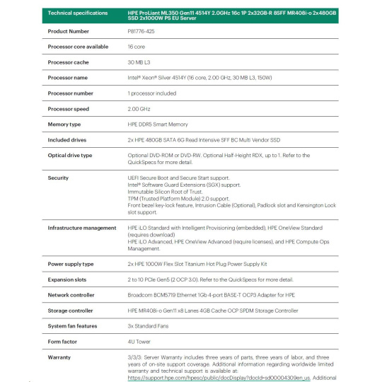 | Model Name | HPE ProLiant ML350 Gen11 4514Y 2.0GHz 16c 1P 2x32GB-R 8SFF MR408i-o 2x480GB SSD 2x1000W PS EU Server |