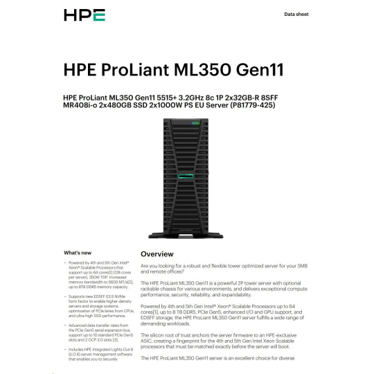 HPE PL ML350g11 5515+ (3.2G/8C) 2x32G (P64706) 8-24SFF MR408i-o/4G 2x480G SSD 2x1000W 4x1G Smart Choice.
