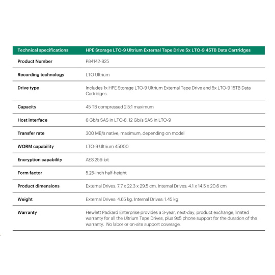 HPE Storage LTO-9 Ultrium External Tape Drive (BC042A) + 5x LTO-9 45TB Data Cartridges (Q2079A) Smart choice.