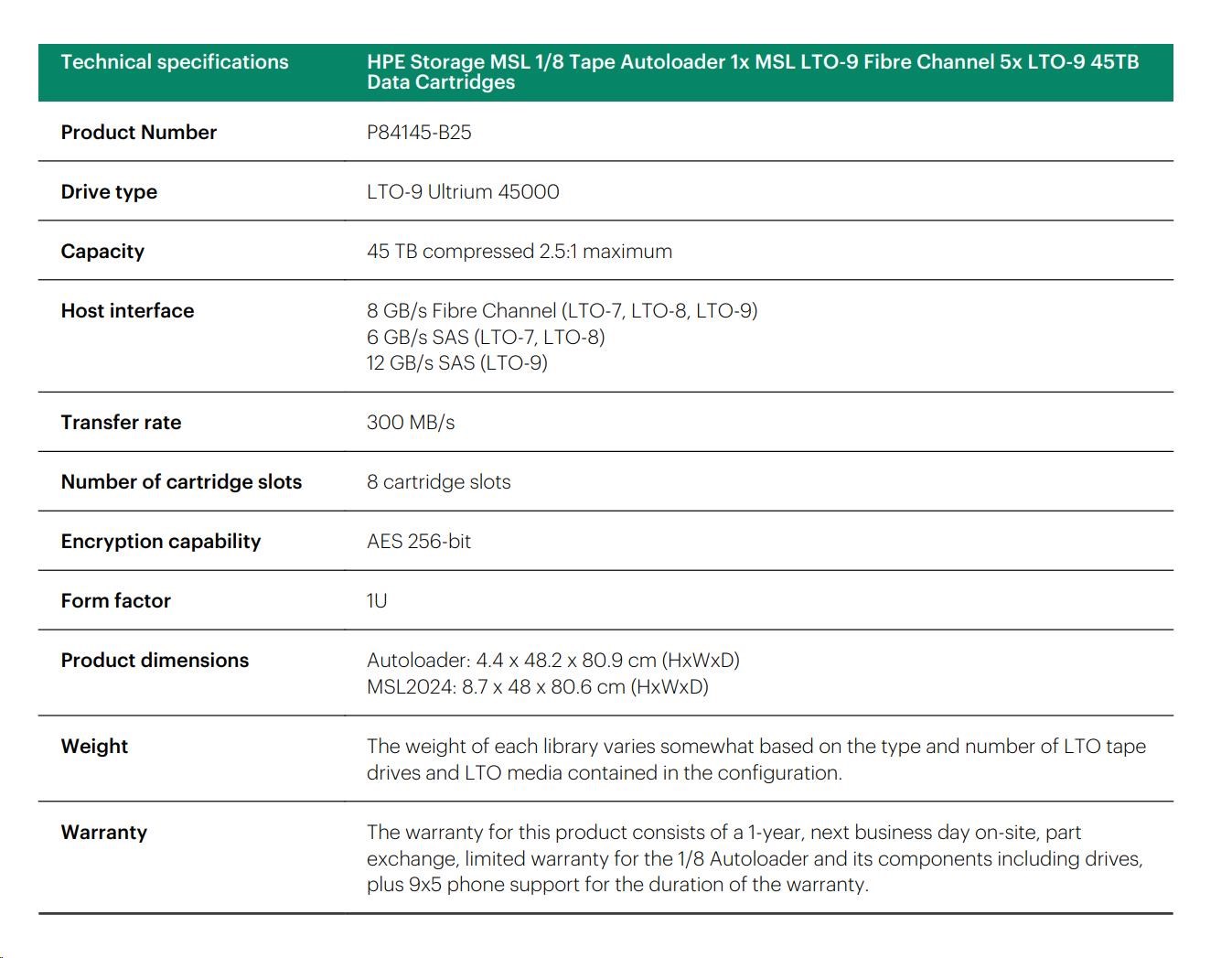 HPE Storage MSL 1/8 Tape Autoloader 1x MSL LTO-9 Fibre Channel 5x LTO-9 45TB Data Cartridges.