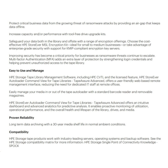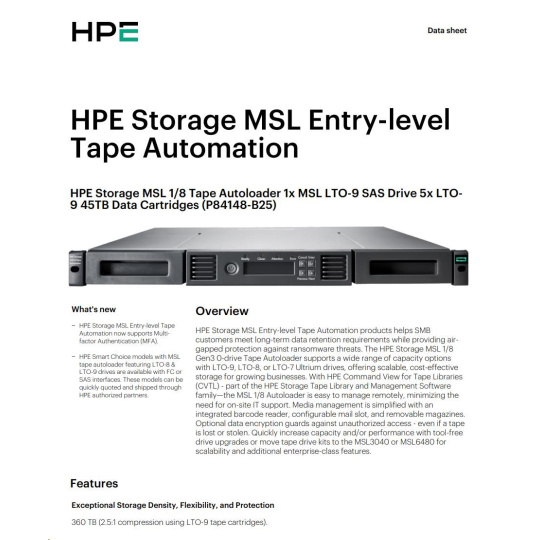 HPE Storage MSL 1/8 Tape Autoloader 1x MSL LTO-9 SAS Drive 5x LTO-9 45TB Data Cartridges.