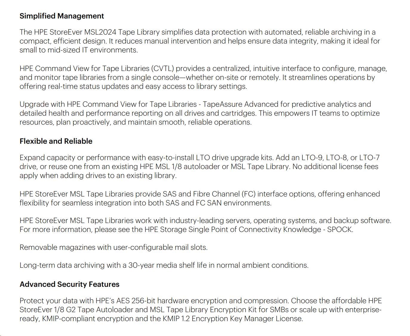 HPE Storage MSL2024 Tape Library 1x MSL LTO-9 Fibre Channel 15x LTO-9 45TB Data Cartridges