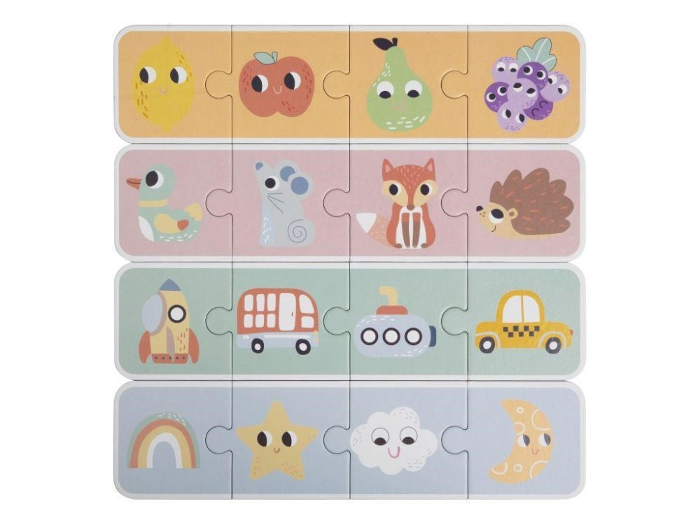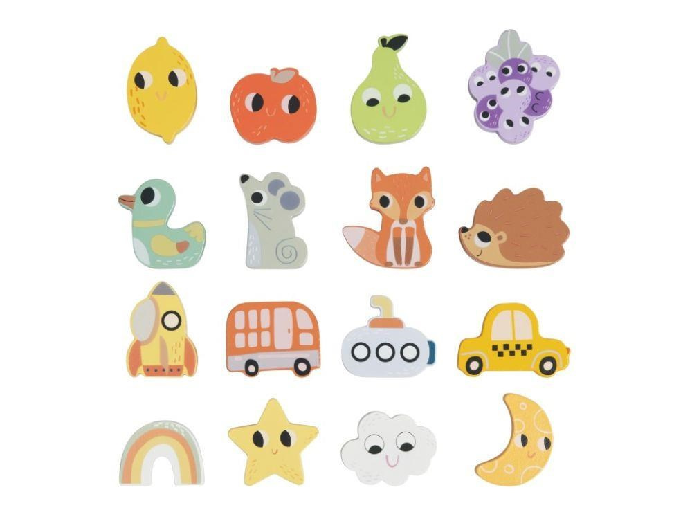Společenská hra pro děti i celou rodinu Hmatej a najdi nabízí spoustu zábavy a možností ke hře. Hra, která dokonale potrénuje a zdokonalí motorické dovednosti, spočívá v hledání správného dřevěného předmětu v kyblíku, kdy pouze hmatem musí hráč najít požadovaný tvar. Hru můžete hrát různým způsobem a přizpůsobit ji věku i dovednostem každého hráče. Užijte si společné chvíle při hmatání a hledání zvířátek, dopravních prostředků a dalších tvarů..