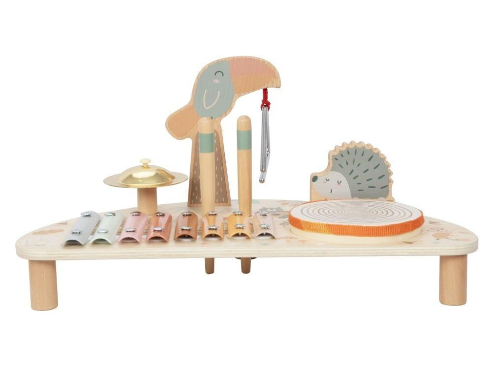 Dřevěný hudební stoleček pro děti se sadou 5 hudebních nástrojů na jednom místě, s krásnou malbou a se zvířátky z lesa, probudí lásku k hudbě v každém dítěti. Hudební stoleček obsahuje základní dětské hudební nástroje, které stimulují smysly, zdokonalují jemnou motoriku, seznámí děti s tím, jaké zvuky který nástroj vydává, jak se na něj hraje..