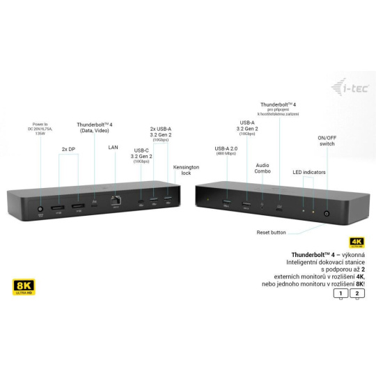 Díky množství USB portů (včetně USB 3.2 Gen 2 s rychlostí až 10 Gbps), portu Thunderbolt“ 4 nabízejícímu buď výstup v 8K, nebo ultra rychlý přenos dat 40 Gbps, a spolehlivému vysokorychlostnímu LAN připojení je tato dokovací stanice ideálním řešením pro náročné profesionály. Samozřejmostí je také podpora napájení až 90 W pro nabíjení notebooku nebo tabletu.