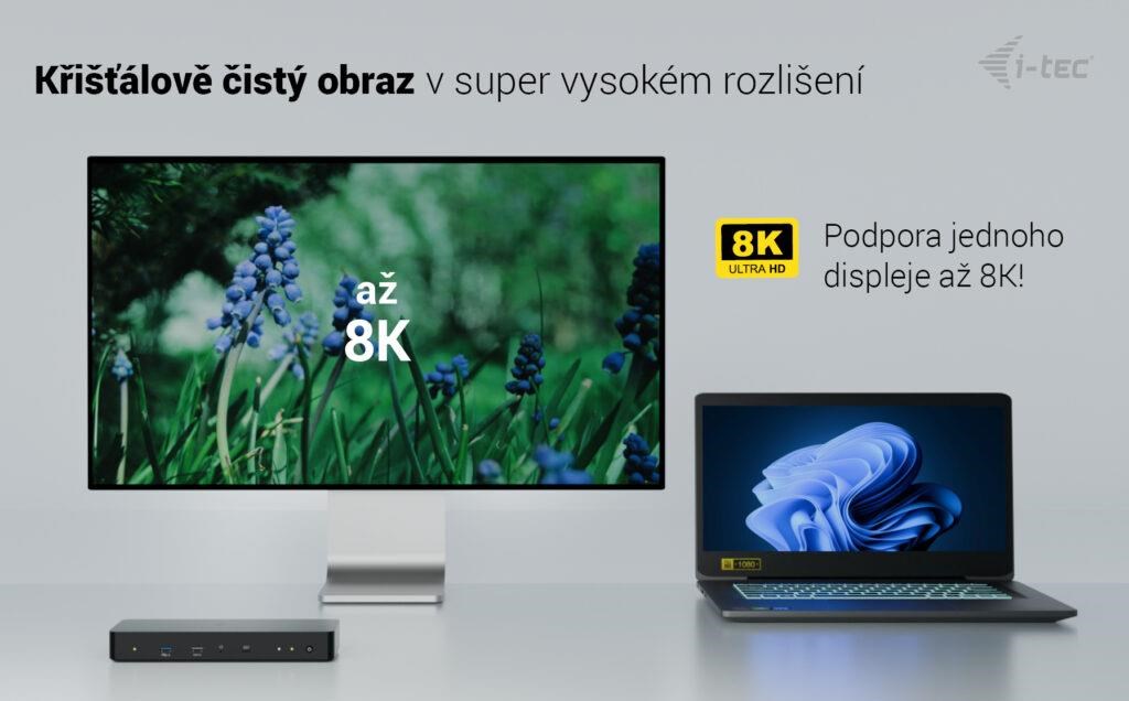 • Podporuje rozlišení až 8K nebo dva 4K monitory s obnovovací frekvencí až 60 Hz.