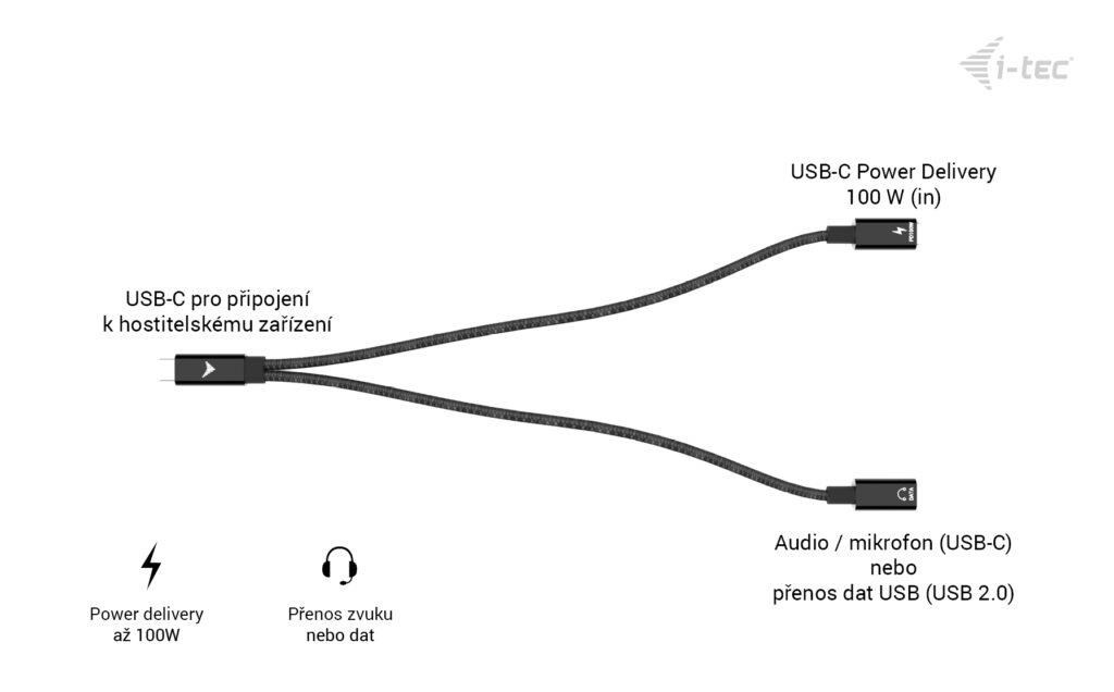 - USB-C řešení 2 v 1 – Umožňuje současné nabíjení a přenos dat (480 Mbps) nebo připojení audio/mikrofonního zařízení přes jediný USB-C port.