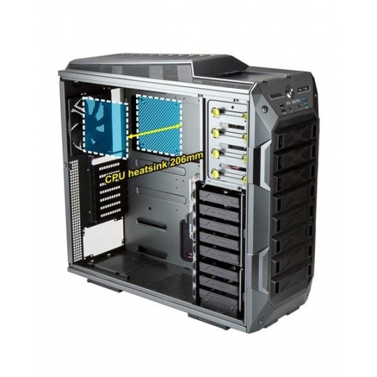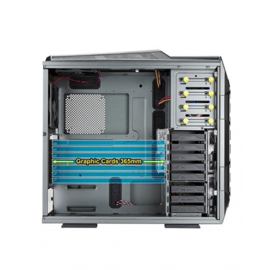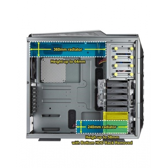 Tak abyste si mohli využít maximální výkon svého počítače, lze dovnitř skříně zakomponovat dvě jednotky vodního chlazení, a to do vrchní části až do délky 360 mm, a spodní částí až do délky 240 mm. Pro optimální cirkulaci vzduchu uvnitř skříně lze umístit až 10 větráků (včetně 4 předinstalovaných).