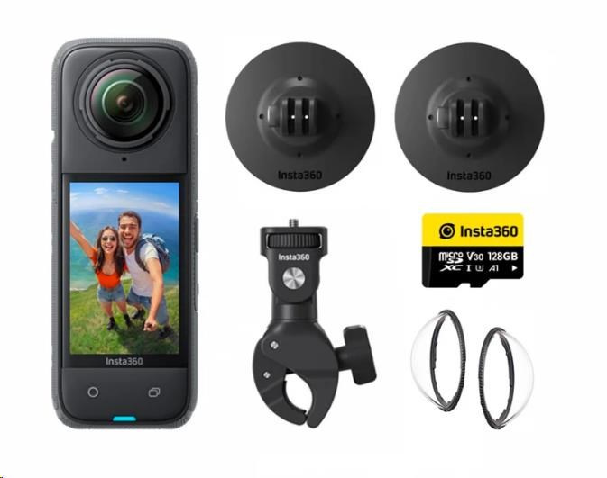 Motocyklová sada s 360° kamerou Insta360 X4 obsahuje navíc nastavitelný držák na řídítka, dvojici přísavek, rychlou 128GB karta a ochranná skla. Rozlišení 360° videa je 8K / 30fps, při 4K až 100 fps. Velký snímač 1/2'pro perfektní záběry v horších světelných podmínkách.Foto rozlišení až 72Mpx. Kvalitní robustní konstrukce, velký dotykový 2,5“ displej, vodotěsná do 10 m. Účinná stabilizace FlowState s 6osým gyroskopem. Baterie s velkou kapacitou 2290 mAh. Ovládání gesty, hlasové ovládání 2.0. Video módy Video, Active HDR, Timelapse, TimeShift, Bullet Time, Loop Recording, Pre-recording. Rozměr kamery: 46 x 123,6 x 37,6 mm.