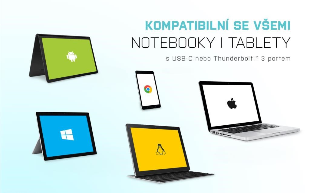 - 1x USB-C 3.1 nebo Thunderbolt 3 konektor, přenosová rychlost až 10 Gbps (USB-C), resp. 40Gbps (Thunderbolt 3), pro připojení adaptéru k notebooku, tabletu nebo PC