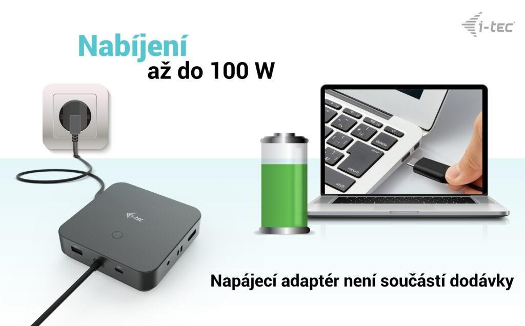 Poskytuje až 100W Power Delivery pro kompatibilní notebooky a tablety s rozhraním USB-C, USB4 a Thunderbolt. Hostitelské zařízení musí podporovat USB-C Power Delivery.