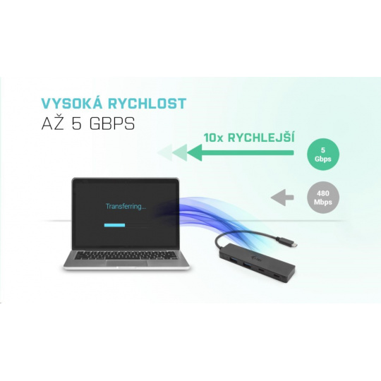 Hub nevyžaduje instalaci ovladačů, pouze jej pomocí USB-C kabelu připojíte a můžete jej ihned začít využívat. Hub má vestavěnou přepěťovou ochranu vašeho počítače pro případ zkratu na periferních zařízeních. Samozřejmostí je zpětná kompatibilita s USB 2.0. Díky kompaktním rozměrům a nízké hmotnosti jej můžete mít v brašně stále sebou – kovový povrch ostatně chrání hub před poškozením a před poškrábáním.