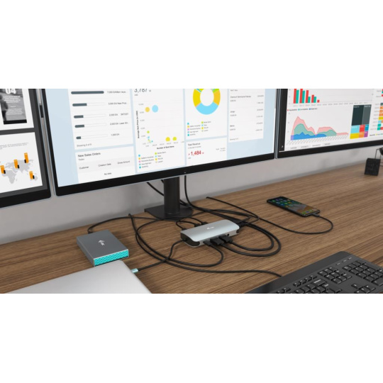 Malá kovová USB-C dokovací stanice, která dokáže připojit až tři externí monitory*. Jednoduše připojte váš notebook či tablet (instalace ovladačů není nutná) a využijte rychlého datového USB, připojení k internetu prostřednictvím LAN portu, spolu s možností připojit vaše sluchátka a mikrofon. Samozřejmostí je podpora napájení vašeho notebooku, a to až do 100 W, což znamená, že budete schopni nabít všechny notebooky a tablety, které nabíjení prostřednictvím USB-C (USB-C Power Delivery) podporují.