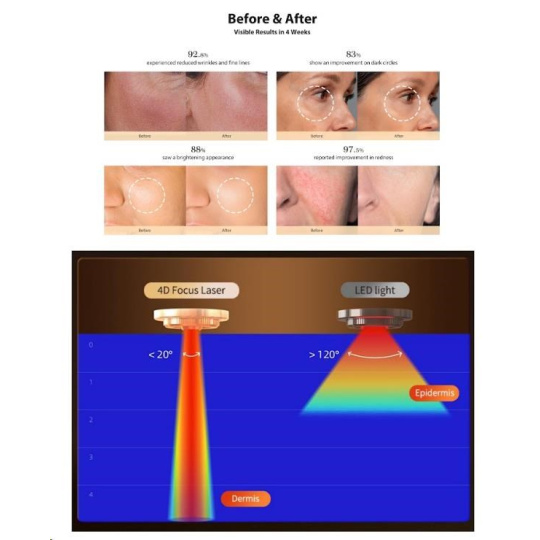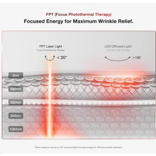Zatímco většina domácích masek spoléhá na technologii LED, JOVS 4D jde o krok dál. Využívá pokročilou FPT (Focal Photothermal Therapy) technologii , která koncentruje energii laseru do úzkých paprsků s úhlem menším než 20° , na rozdíl od více než 120° u běžných LED. Díky tomu pronikají mnohem hlouběji do dermis – vrstvy kůže, kde vzniká kolagen. Díky 6x vyšší energetické účinnosti oproti LED diodám dokáže laser efektivněji stimulovat buněčnou obnovu a cíleně řešit příčiny stárnutí pleti.