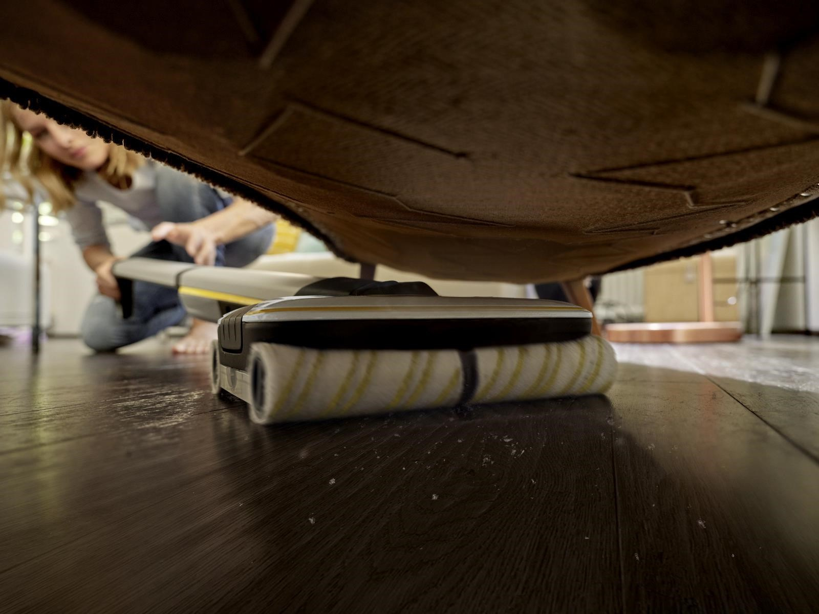 ** Čistič podlah Kärcher zkracuje dobu čištění až o 50 %, protože běžné nečistoty z domácnosti lze odstranit z tvrdých podlah v jediném kroku, aniž by bylo nutné před vytíráním vysávat.