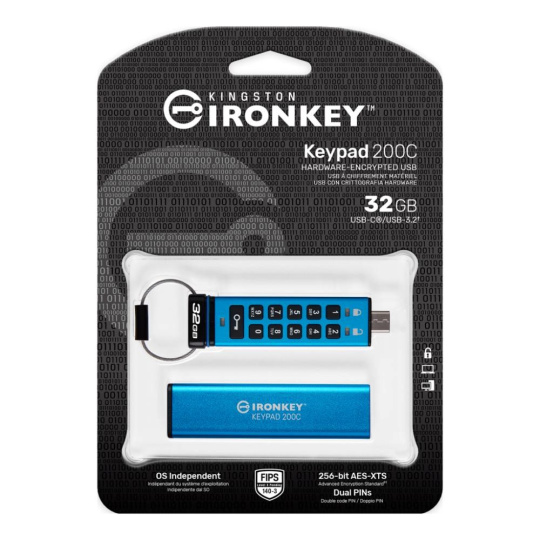Řada Kingston IronKey Keypad 200 se skládá z hardwarově šifrovaných disků USB typu A a USB typu C nezávislých na operačním systému s alfanumerickou klávesnicí pro snadný přístup pomocí kódu PIN. KP200 obsahuje 256bitové hardwarové šifrování XTS-AES. Je také certifikován podle standardu FIPS 140-3 Level 3 (pending) pro zabezpečení vojenské úrovně s vylepšeními, která dále zvyšují laťku ochrany dat. Jeho obvody jsou pokryty vrstvou speciálního epoxidu, který prakticky znemožňuje vyjmutí součástek bez jejich poškození; tento odolný epoxid brání útokům na polovodičové součástky.