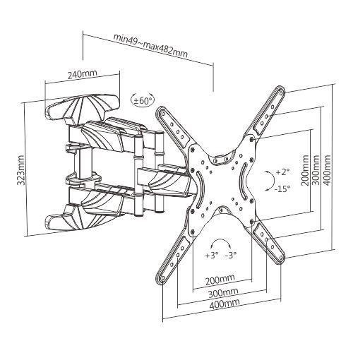 Kvalitní otočný sklopný držák Tv Fiber SP500 Špičkový nástěnný držák Tv 32-60", otočný, sklopný +2° / -15°, vzdálenost 49-482mm, korekce roviny +/- 3°, systém vedení kabeláže, snadná polohovatelnost, VESA 75x75 až 400x400, nosnost 40kg Televizní držák, který díky svému špičkovému zpracování a krásnému designu můžeme zařadit k vyšší třídě, přitom výhodná cena odpovídá základním držákům. Držák Fiber SP500 je vhodný pro zavěšení všech typů Tv, které mají hmotnost do 40kg a které podporují VESA standardy 75x75 až 400x400. Nastavení televize do požadované polohy je velmi snadné, obrazovku můžete otáčet do stran, naklápět, odsouvat nebo přisouvat ke zdi, upravit její rovinu. Veškerou nevzhlednou kabeláž snadno ukryjete pod kryty ramen a nebudou nikde překážet. Unikátní konstrukce Tv držáku zajistí, že se ramena nebudou prověšovat, televize vždy bude spolehlivě držet v nastavené pozici a uchycení bude vždy spolehlivé. Instalace držáku na stěnu je velmi snadná a intuitivní, zvládne ji i laik, montážní materiál je součástí balení. Kvalitu tohoto Tv držáku podtrhuje záruka 5 let. Vynikající nástěnný držák pro zavěšení LCD, LED, plazmových Tv s úhlopříčkou 32-60". Držák Tv otáčí do stran, naklápí, délkově nastavuje, koriguje rovinu. Vedení kabeláže, TOP design, držák za skvělou cenu - Fiber SP500 Technické údaje: maximální zatížení 40kg podporuje VESA standardy 75x75 až 400x400 zavěšení televizorů s úhlopříčkou 32" až 60" otáčení do stran +/- 60° náklon nahoru i dole + 2° / -15° korekce roviny +/- 3° minimální vzdálenost Tv od zdi 49mm maximální vzdálenost Tv od zdi 482mm systém pro skryté vedení kabeláže kvalitní a spolehlivá ocelová konstrukce, nevznikají vůle ani prověšení moderní krásný design instalační materiál součástí balení velmi snadná instalace záruka 5 let Nástěnný otočný a sklopný, výsuvný držák na LCD LED Tv 32-60", TOP kvalita a krásné provedení Fiber SP500 Televizní držák Fiber SP500 podporuje VESA standardy pro zavěšení Tv: VESA 75x75 VESA 100x100 VESA 200x100 VESA 200x200 VESA 300x200 VESA 300x300 VESA 400x200 a 200x400 VESA 400x400 držák nepodporuje VESA 400x300 ani 300x400 Držák SP500 je vhodný na všechny značky a typy televizí, které podporují kterýkoliv z výše uvedených VESA standardů a jejichž hmotnost není vyšší jak 40kg..