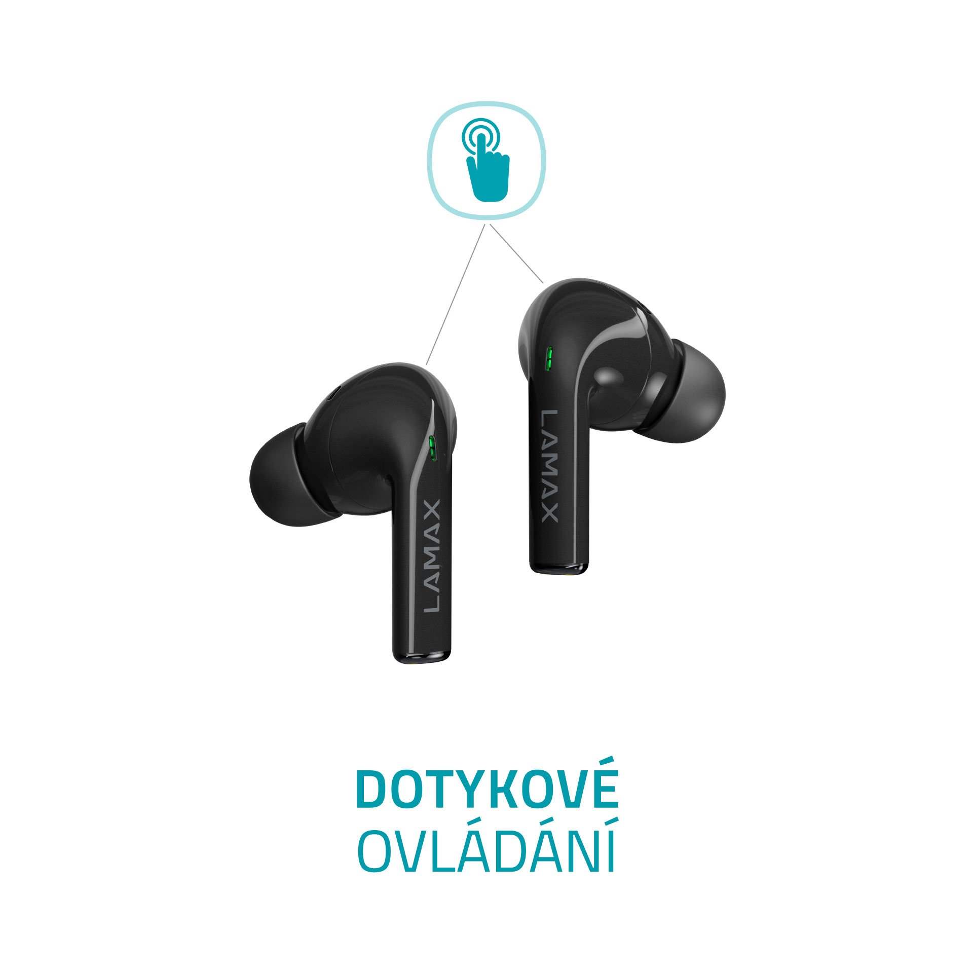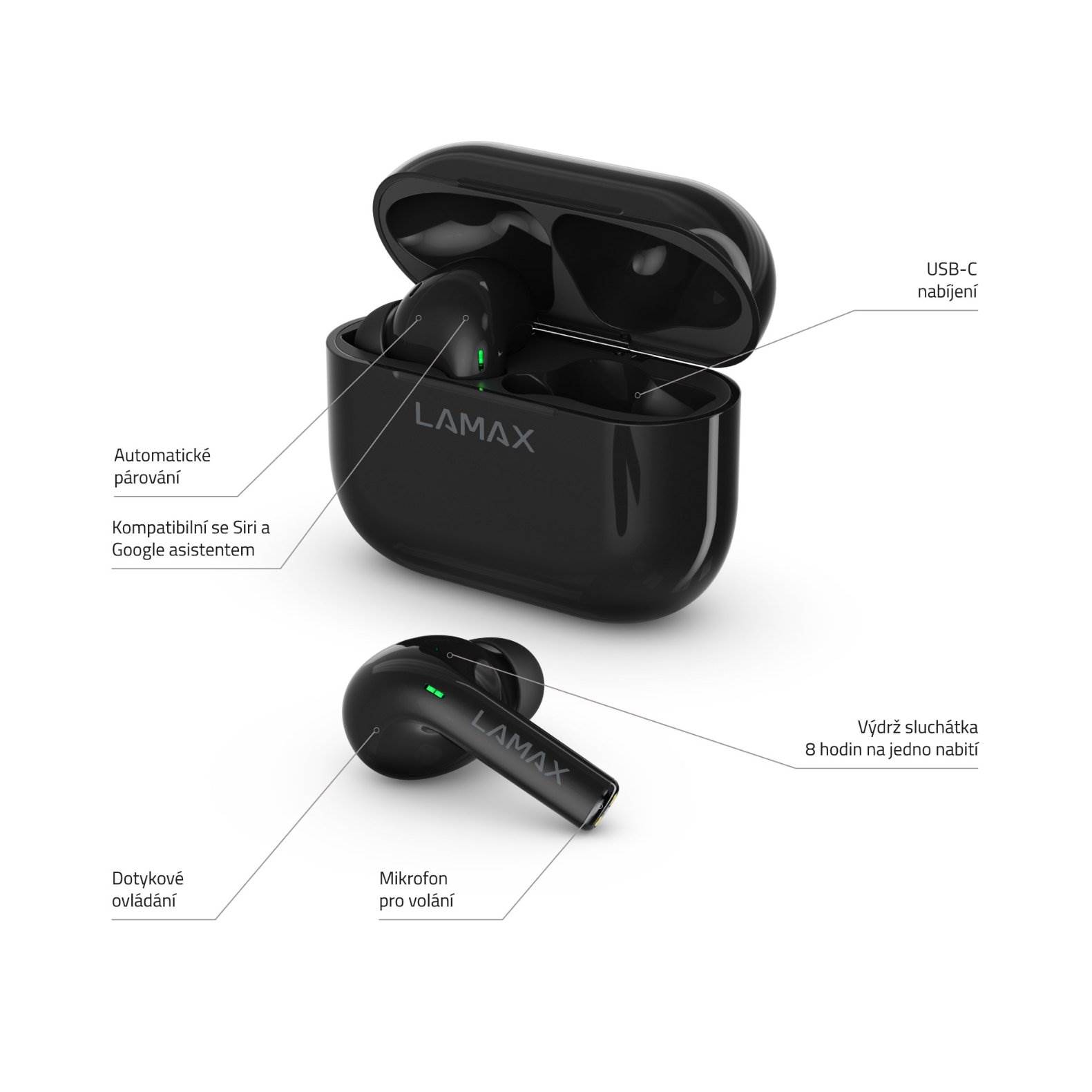 Bezdrátová TWS sluchátka, do uší, 8h výdrž/1 nabití, 40 hodin výdrž celkem, Bluetooth 5.1, dosah až 10 metrů, dotykové ovládání, USB-C, LAMAX BeatBass® technologie, automatické párování, herní režim, malé nabíjecí pouzdro, ukazatel nabíjení, kodeky AAC a SBC, podpora hlasových asistentů, náhradní náušníky..... více