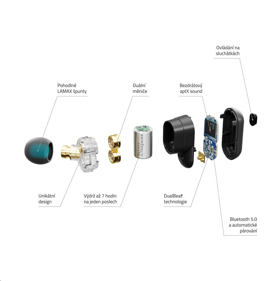 V čem je vtip duálních měničů s naší LAMAX DualBeat® technologií? Každý měnič se stará o svoje zvukový spektrum. Pro tučný basy používáme o třetinu lehčí titanovou membránu, pro křišťálově čistý středy a výšky naopak membránu se silnou tuhostí. Perfektní poměr frekvencí pro každej track z tvýho playlistu potom řídí naše LAMAX DualBeat® technologie, která oba výstupy pošle na finální mix až do tvýho ucha. Navíc v top bezdrátový kvalitě, díky kodeku aptX, který boostuje přenosovou rychlost Bluetooth 5.0.