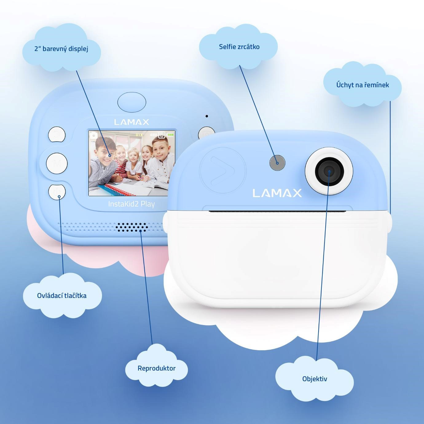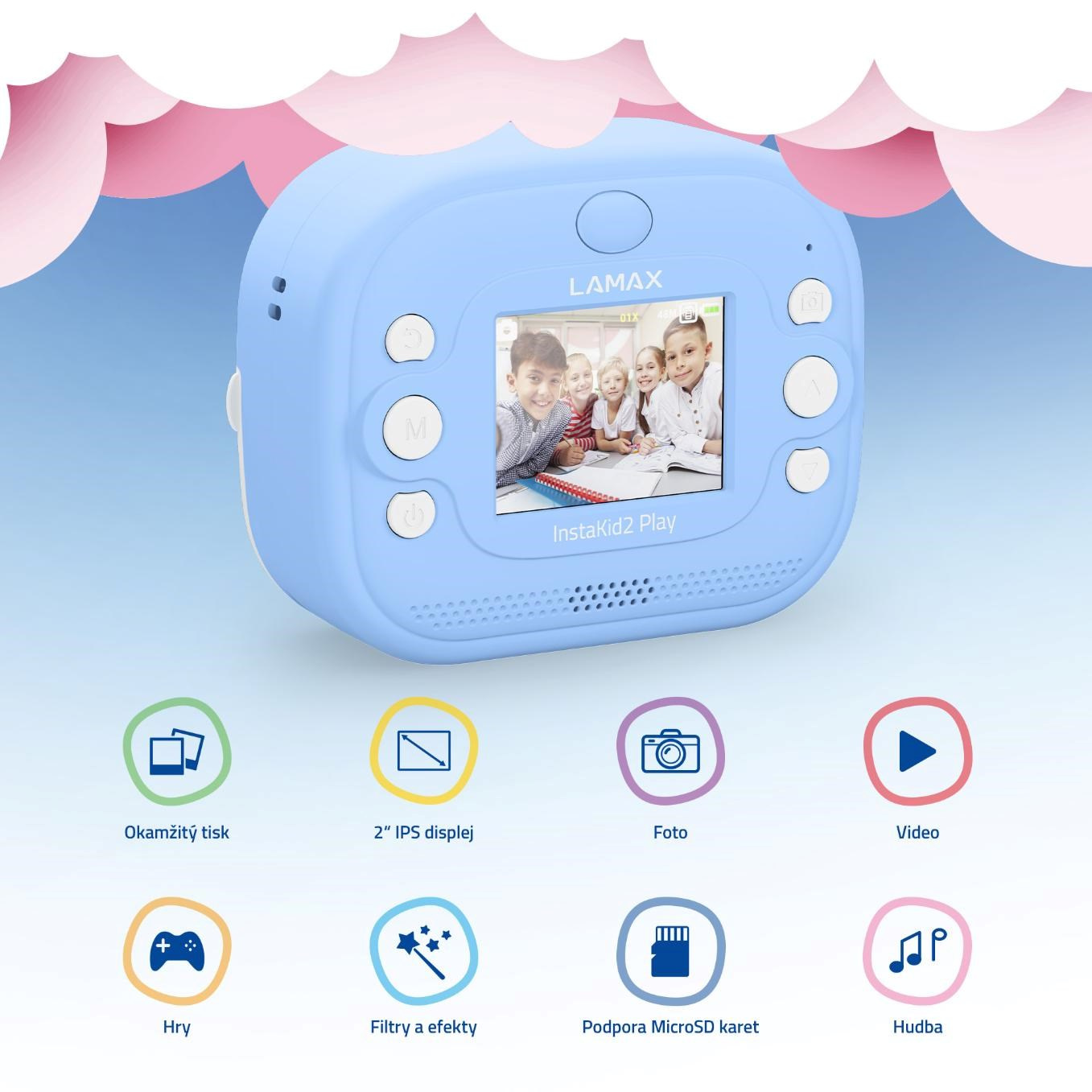 LAMAX InstaKid2 Play je foťák, který neztrácí čas. Děti si s ním jednoduše zaznamenají každý důležitý moment a během vteřiny ho mají v ruce. Černobílé snímky se mohou proměnit v barevné vzpomínky pomocí fixů, které jsou součástí balení – stačí je jen vybarvit, přidat do vlastního alba nebo jimi potěšit třeba babičku. Díky jednoduchému ovládání, dvěma ruličkám v balení (včetně samolepicí), originálnímu designu a výkonné kameře se 48 Mpx a FullHD videem, se foťák stane nepostradatelným společníkem na výlety, oslavy i tvořivá odpoledne s kamarády. Oblíbí si ho i starší děti, které si mohou své snímky i videa ukládat na microSD kartu a uchovat si tak své první filmařské pokusy. Na výběr je růžovánebo modrá varianta a nechybí ani praktická šňůrka na krk, aby měly děti foťák stále po ruce. A když zrovna nefotí? Zábavu zajistí pět her přímo ve fotoaparátu. Tento foťáček totiž není jen o vzpomínkách, je také o radosti, sebevyjádření a fantazii.