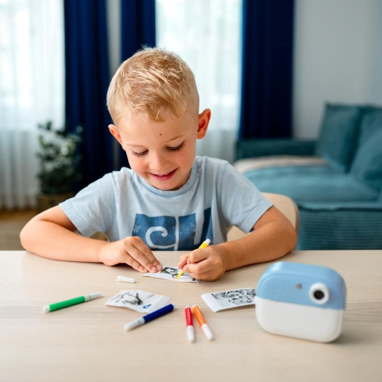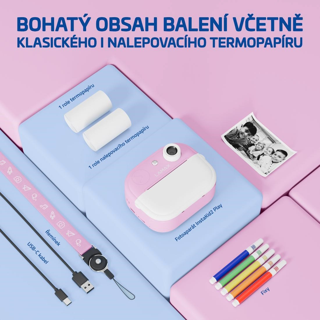 LAMAX InstaKid2 Play je foťák, který neztrácí čas. Děti si s ním jednoduše zaznamenají každý důležitý moment a během vteřiny ho mají v ruce. Černobílé snímky se mohou proměnit v barevné vzpomínky pomocí fixů, které jsou součástí balení – stačí je jen vybarvit, přidat do vlastního alba nebo jimi potěšit třeba babičku. Díky jednoduchému ovládání, dvěma ruličkám v balení (včetně samolepicí), originálnímu designu a výkonné kameře se 48 Mpx a FullHD videem, se foťák stane nepostradatelným společníkem na výlety, oslavy i tvořivá odpoledne s kamarády. Oblíbí si ho i starší děti, které si mohou své snímky i videa ukládat na microSD kartu a uchovat si tak své první filmařské pokusy. Na výběr je růžovánebo modrá varianta a nechybí ani praktická šňůrka na krk, aby měly děti foťák stále po ruce. A když zrovna nefotí? Zábavu zajistí pět her přímo ve fotoaparátu. Tento foťáček totiž není jen o vzpomínkách, je také o radosti, sebevyjádření a fantazii.
