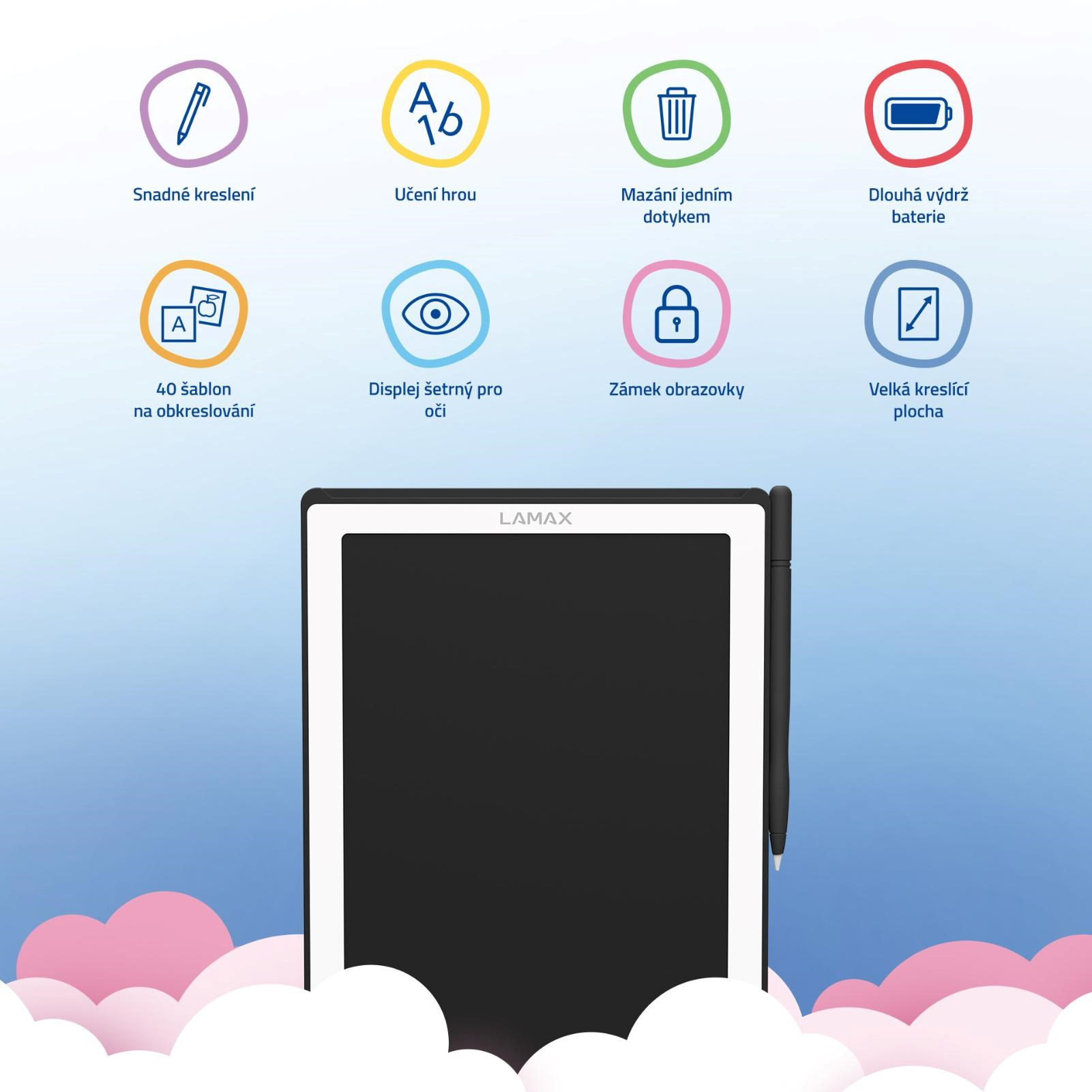 Ať už si děti chtějí kreslit zvířátka, trénovat první písmena nebo jen tak čmárat, co je právě napadne, LAMAX PencilKid1 jim poskytne prostor pro nekonečné tvoření. Kreslicí tabulka s 40 zábavnými obkreslovacími šablonami pomáhá rozvíjet kreativitu, jemnou motoriku i základy angličtiny. Předlohy je zábavným způsobem seznámí s písmeny, čísly, zvířaty, dopravními prostředky nebo třeba ovocem, a díky anglickým popiskům se děti přirozeně dostávají i k prvním cizojazyčným slovíčkům. Tabulka ale není určena jen pro nejmenší. Snadno si ji oblíbí i starší děti, které si do ní mohou zapisovat nápady nebo domácí úkoly do školy. Velká plocha nabízí dostatek místa pro psaní i kreslení a je zároveň šetrná k očím, protože nebliká a nevydává modré světlo. Po každém použití stačí jediné stisknutí tlačítka a plocha je připravena na nové nápady. Díky praktickému obalu ve tvaru knížky zůstane tabulka i se šablonami pěkně pohromadě a děti si ji mohou vzít kamkoliv – do školy, na výlet, k babičce nebo do čekárny u lékaře. A co je nejlepší? Není potřeba žádný papír, pastelky ani fixy. Jen jeden lehký pomocník, který podporuje tvoření, učení i zábavu ve chvílích, kdy potřebujete mít trochu klid.