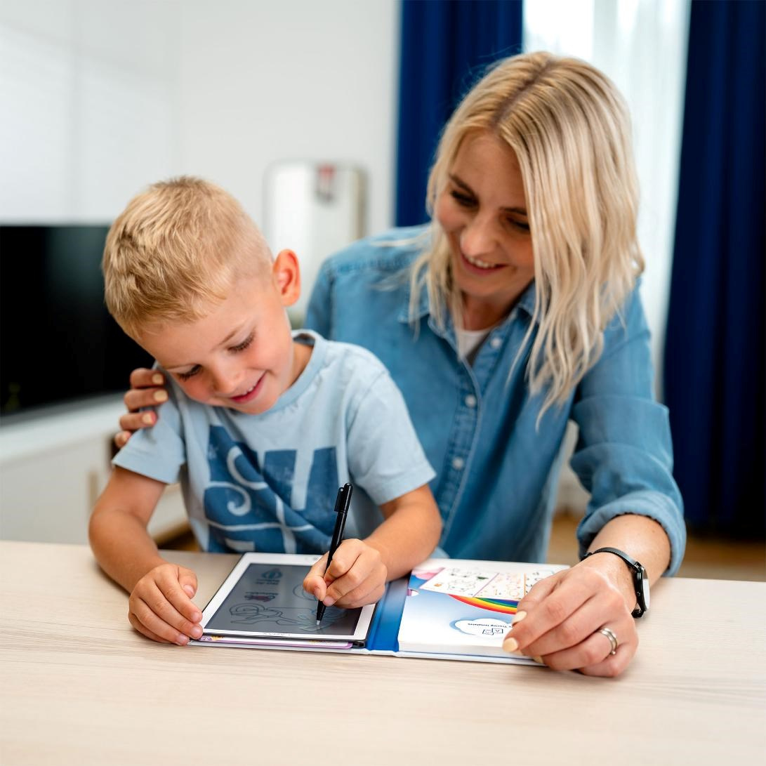 Velká plocha tabulky nabízí spoustu místa pro kreslení i zapisování nápadů, a přitom zůstává šetrná k dětským očím. Displej nebliká, nevyzařuje modré světlo a nenamáhá zrak ani při delším používání. Celý set, tabulka i šablony, je navíc uložený v praktickém obalu ve tvaru knížky, díky kterému zůstane všechno pěkně pohromadě a děti si tak mohou vzít zábavu kamkoliv s sebou.
