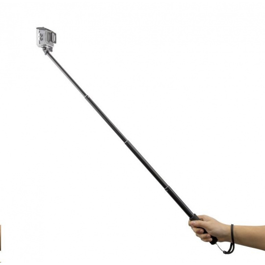 Držák je vybaven rukojetí s příjemným gumovým potahem proti prokluzu, doplněnou poutkem a na spodním konci stativovým závitem, díky kterému můžete monopod připojit k dalšímu příslušenství. Na horním konci má tyč adaptér pro snadné připojení akční kamery jakékoliv značky.