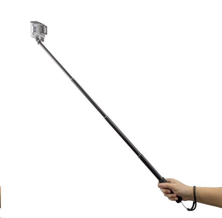 Držák je vybaven rukojetí s příjemným gumovým potahem proti prokluzu, doplněnou poutkem a na spodním konci stativovým závitem, díky kterému můžete monopod připojit k dalšímu příslušenství. Na horním konci má tyč adaptér pro snadné připojení akční kamery jakékoliv značky.