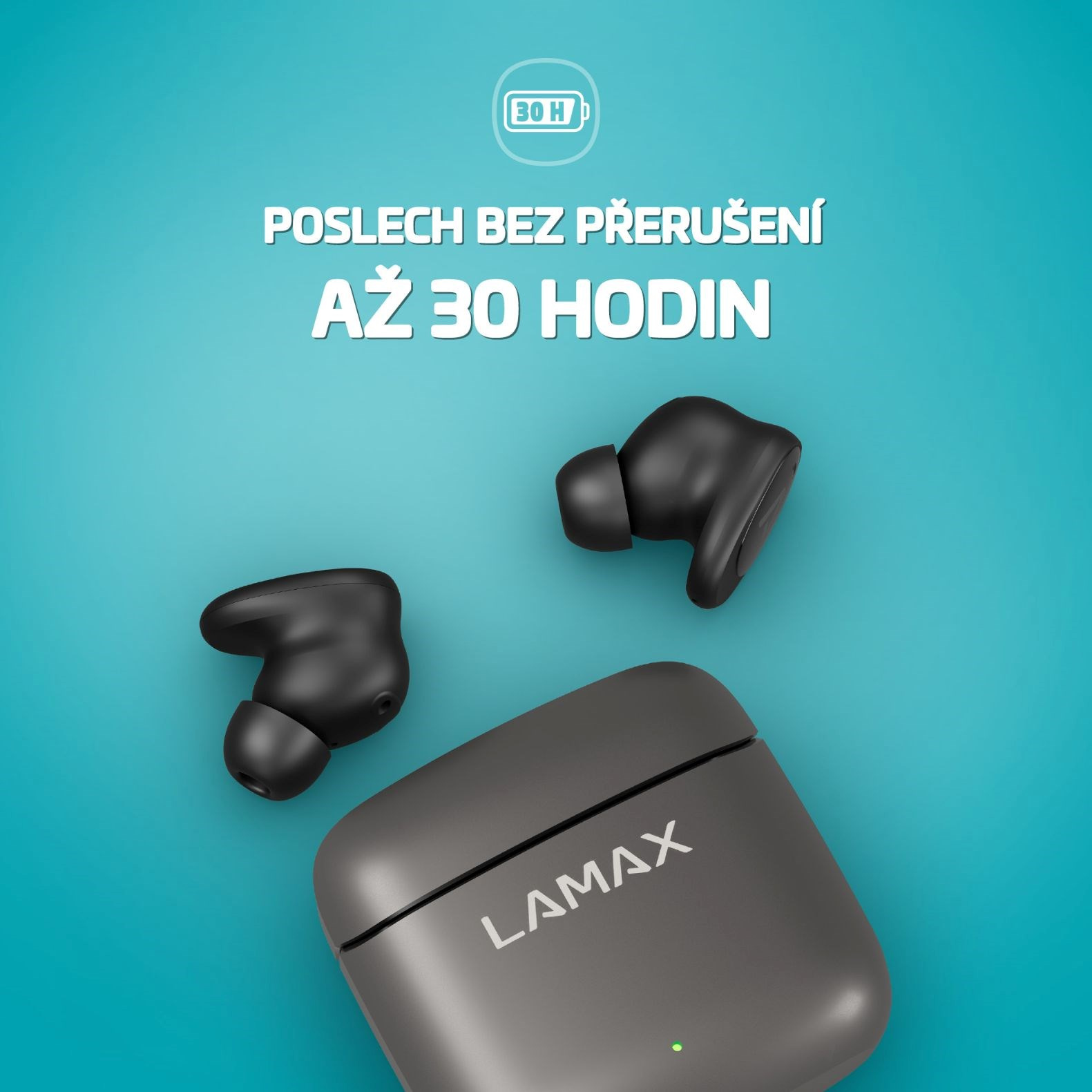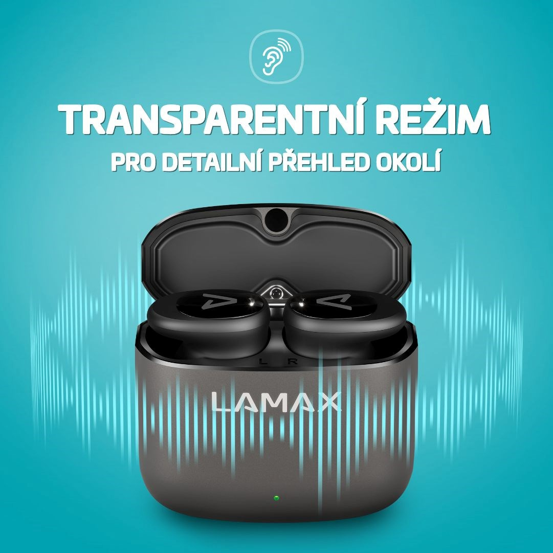 Špunty do uší a jsi v jiným světě, bez hluku z MHD nebo diskutujících kolegů v práci. LAMAX SteelDots3 ANC aktivně potlačí okolní zvuky, ať si můžeš užívat svůj nadupanej playlist nebo chytrý podcasty. Kontakt s realitou ale udržuje transparentní režim pro tvoji bezpečnost. Čistej a vyrovnanej zvuk každýho tónu ještě podporuje kompatibilita s kodeky AAC a SBC. Taky mikrofon je kvalitka, takže při volání nebo videohovorech tě všichni jasně uslyší. Zapomeň na rozmotávání kabelů, Bluetooth 5.3 tě okamžitě automaticky připojí. Ovládání zvládneš bez návodů, je fakt snadný, dotekem vyřešíš vše. Když si mákneš při sportu a pot teče proudem, krytí IPX5 si s tím hravě poradí. Všechny tyhle výhody si můžeš užívat až 8 hodin na jedno nabití a ještě další máš v bytelným kovovým dobíjecím pouzdře, takže suma sumárum až 30 hodin zábavy. Pak šťávu doplníš přes USB-C. Jsi ready na tuhle výzvu?