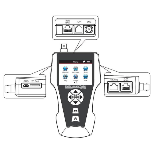 Pokročilý tester pro testování a diagnostiku různých typů kabelů/vedení. Využívá technologii TDR (Time Domain Reflectometry) k přesné lokalizaci a identifikaci závad ve vedení. Zařízení je vybaveno velkým LCD displejem, který zobrazuje všechny patřičné informace a podporuje vícejazyčné nastavení. Kromě toho je vybaven vestavěným tónovým generátorem a funkcí vyhledávání portů, takže je ideální pro testování síťových kabelů, telefonních linek a videokabelů. - Tester nabízí širokou škálu funkcí pro různé typy testování a diagnostiku. - Tester UTP/STP (RJ-45), koaxiálních (BNC), telefonních (RJ-11) a USB vedení. - Ohmické metody měření, včetně rozšířených testů napájení PoE a odezvy PING. Výbava: detekční sondy pro vyhledávání kabelového spojení, 1x protismyčka, barevný LCD displej