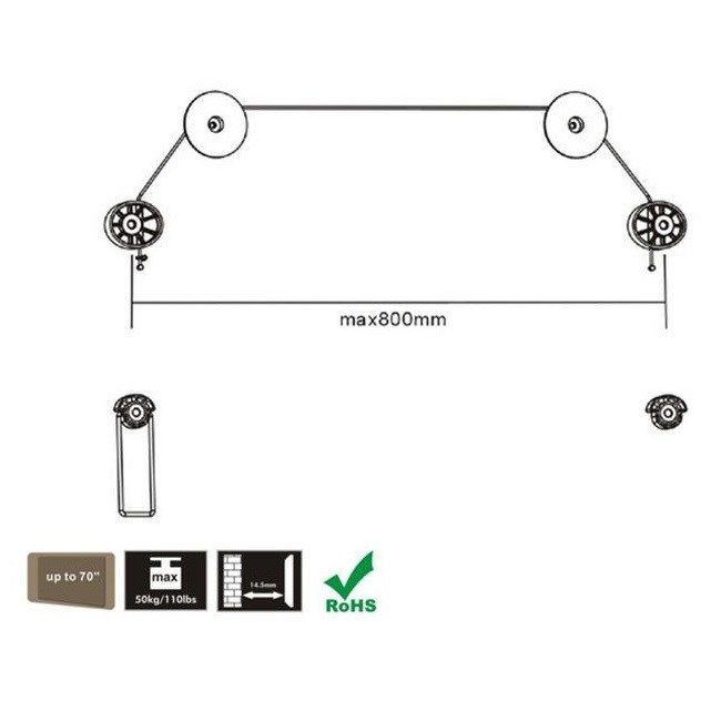 Lankový držák na Tv Fiber Mounts M5C57 Závěsný lankový držák na Tv 37-70", vzdálenost Tv od zdi 14mm, snadná instalace, lankový systém, VESA 200x200 až 800x400, nosnost 50kg Speciální závěsný lankový držák pro zavěšení televizorů na stěnu - odsazení Tv pouze 14 mm, možnost odsadit Tv od zdi pro snadnou zapojení konektorů. Držák má nosnost 50kg a je vhodný především na tenké LCD, LED, OLED a QLED televizory nebo displeje. Podporuje VESA standardy 200x200 až 800x400. Instalace je velmi snadná a rychlá, snadné je i nastavení Tv do roviny. Součástí balení je instalační materiál. Záruka 5 let. Speciální nástěnný závěsný lankový držák na televizi Fiber Mounts F5M57 Technické údaje: nosnost 50kg podporuje VESA standardy 200x200 až 800x400 na televize a displeje s úhlopříčkou 37" až 70" ideální na tenké televizory, především LCD, LED, OLED a QLED vzdálenost televizoru od zdi pouhých 14 mm snadné nastavení obrazovky do přesné roviny možnost odsazení Tv od zdi pro snadné zapojení konektorů apod. bezpečné inovativní zavěšení televizorů na zeď pomocí lankového systému instalační materiál součástí balení záruka 5 let Závěsný lankový držák na LCD LED OLED a QLED Tv Fiber Mounts F5M57 Lankový držák na Tv Fiber Mounts M5C57 podporuje VESA standardy: VESA 200x200 VESA 300x200 a 200x300 VESA 300x300 VESA 400x200 a 200x400 VESA 400x300 a 300x400 VESA 400x400 VESA 500x300 a 300x500 VESA 600x400 VESA 800x400 Závěsný lankový držák M5C57 je vhodný především na LCD, LED, OLED a QLED televize nebo displeje. Zavěsit můžete všechny televize s hmotností do 50kg, které podporují kterýkoli z výše uvedených VESA standardů..