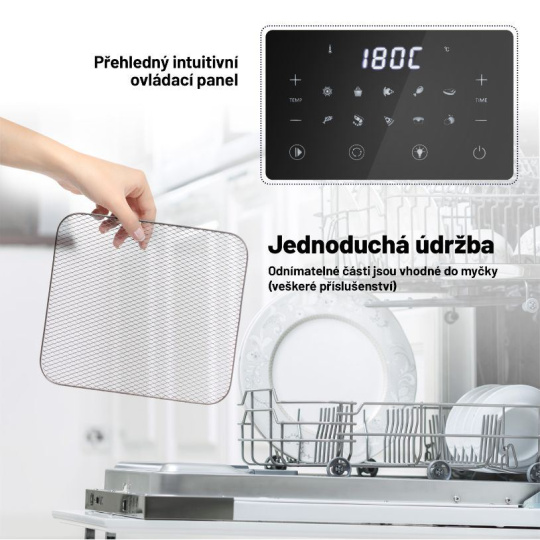 Horkovzdušná trouba s fritézou, objem 15 l, 10 automatických programů, manuální nastavení, kuchařka v balení, digitální displej, pečení, sušení, grilování, dotykové ovládání, teplota 80 – 200°C, čas 5 – 60 min, grilovací mřížka, rotační fritovací koš, rožnicí jehla na kuře, 2 klasické mřížky, odkapávací tác, odnímatelná dvířka pro snazší čištění, příprava 3 pokrmů najednou, odnímatelné části vhodné do myčky.... více