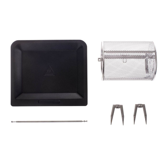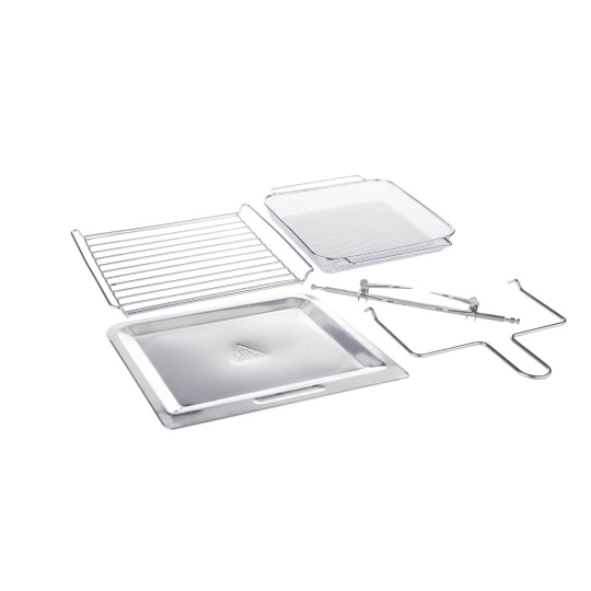 1 klasická mřížka na plech nebo různé formy, 1 rotační koš na hranolky, 1 hlubší mřížka na pečení kuřecích křídel, brambor, 1 plochá mřížka na sušení ovoce či hub, 1 odkapávací plech, který zachycuje tuk a olej, jehla na rožnění celého kuřete, úchyt.