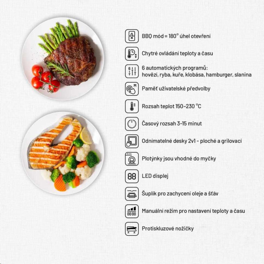 Díky výkonu 2000W si gril bez problému poradí i s prudkým opečením, které je potřeba u kvalitních steaků a disponuje dostatečnou grilovací plochou 1400 cm2. Součástí grilu je praktická miska na odkapávání přebytečného tuku a šťávy. Příjemným bonusem je kvalitní designové provedení vhodné do exteriéru i interiéru.