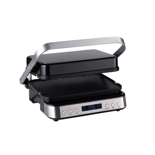 Kontaktní gril na zapékání, který po uvedení do vodorovné polohy přetvoříte na plnohodnotný stolní gril o ploše 1400 cm2.