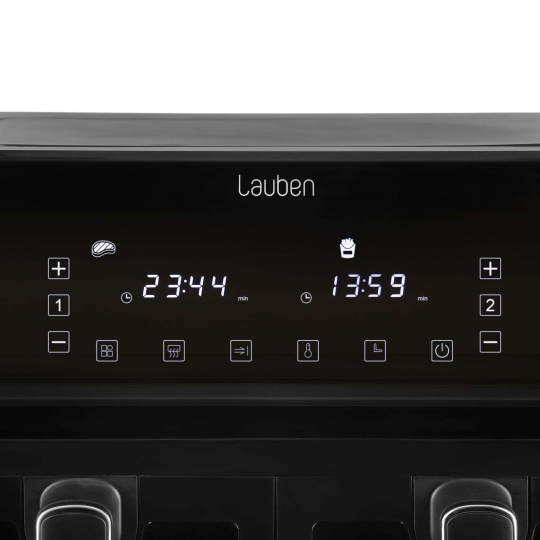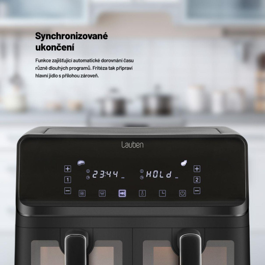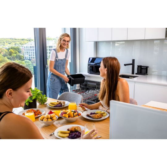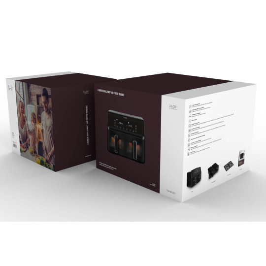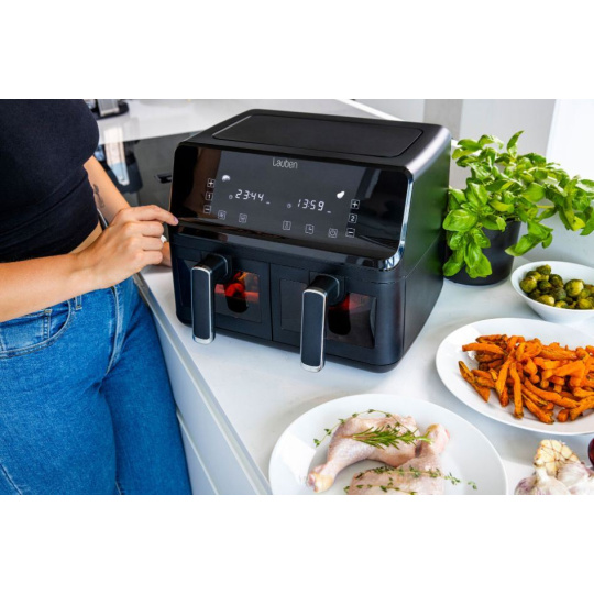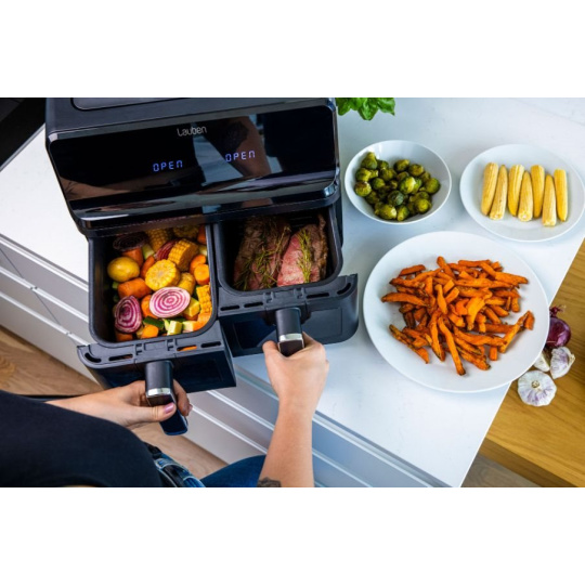 Horkovzdušná fritéza s dvěma koši, celkový objem 8 l, individuální nastavení obou košů zvlášť, možnost přípravy hlavního jídla a přílohy naráz, osvětlení interiéru, průhledná okénka pro vizuální kontrolu pokrmu, 8 přednastavených programů, možnost manuální úpravy času a teploty, technologie Cool Touch a Dualzone®, funkce předehřátí a synchronizované ukončení, přehledný dotykový displej, vnitřní tácy vhodné do myčky, prémiový matný design, 360° cirkulace horkého vzduchu, nastavitelná teplota: 80 – 200 °C, nastavení času 1 – 60 min, příkon 2700 W.