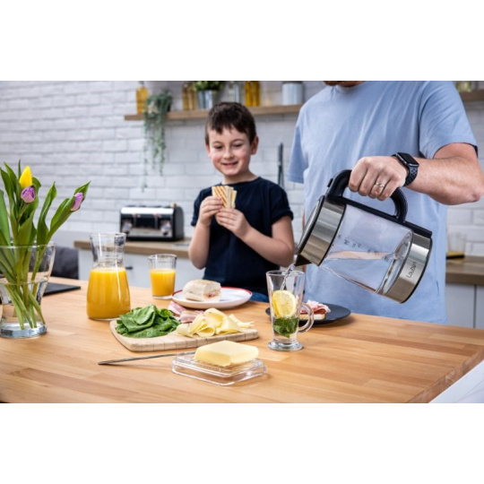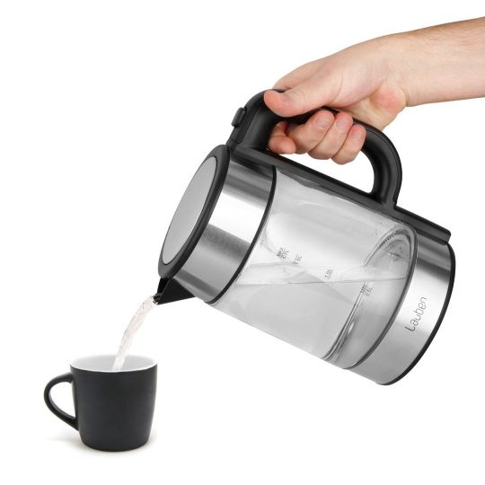 Teplotu volíte v rozmezí 60-100 °C po desetistupňových intervalech. V konvici Lauben ohřejete až 1,7 l vody naráz. Její aktuální množství vždy poznáte díky stupnici na skle. Víko konvice je opatřeno bezpečnostní pojistkou proti rozlití a otevíráte jej snadno, pomocí tlačítka umístěného na držadle.