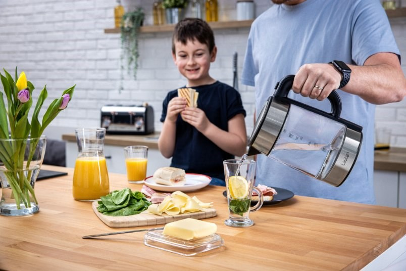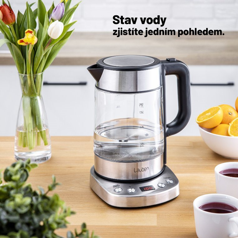 Teplotu volíte v rozmezí 60-100 °C po desetistupňových intervalech. V konvici Lauben ohřejete až 1,7 l vody naráz. Její aktuální množství vždy poznáte díky stupnici na skle. Víko konvice je opatřeno bezpečnostní pojistkou proti rozlití a otevíráte jej snadno, pomocí tlačítka umístěného na držadle.