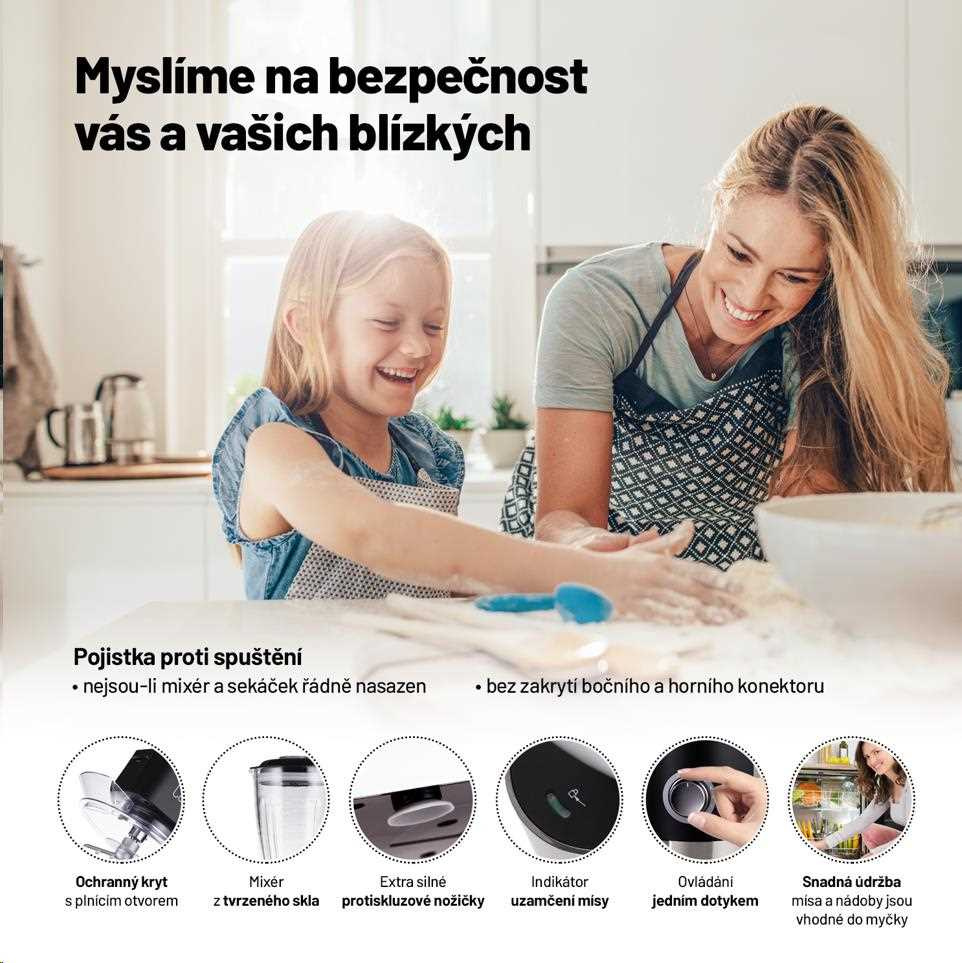 Bezpečnost by při vaření a přípravě potravin měla být vždy na prvním místě. Mysleli jsme na to i při vývoj tohoto kuchyňského robota. Díky pojistce se nikdy robot nespustí, není-li správně uzavřen. Disponuje i pojistkou proti přehřátí a extra silnými protiskluzovými nožkami, které se starají o to, aby robot zůstal na svém místě.