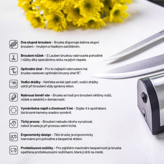 Dobře nabroušený nůž je základem kuchyně. Dnes už ale nemusíte hledat brusiče nožů, díky brusce na nože Lauben Knife Sharpener 4700SB jej budete mít stále po ruce. Bruska zvládne hrubé i hladké začištění a hodí se pro většinu nožů, sekáčků či nůžek. Kvalitní nabroušení zajišťuje optimální brusný úhel 15° a vodicí drážky pro udržení správného sklonu. Brusný kámen je v případě potřeby možné vyměnit, životnost je zhruba pět let. Bruska má ergonomický tvar, vyznačuje se tichým provozem a je vyrobena z nerezu, takže ji jen tak něco neublíží. Bezpečnost při provozu zajišťují protiskluzové nožičky.