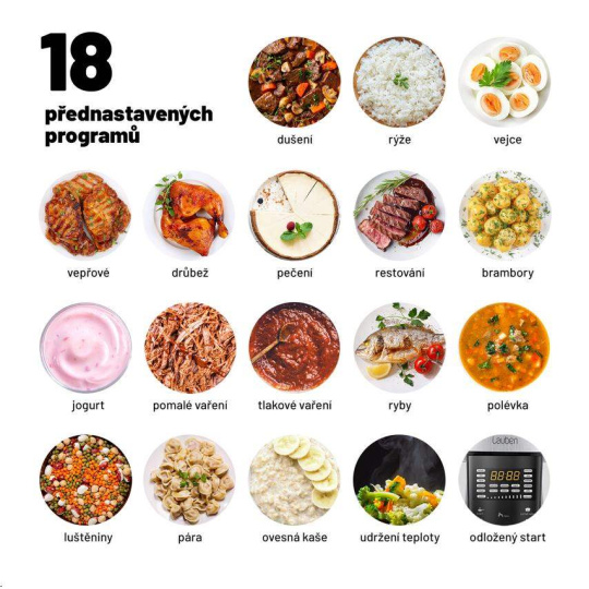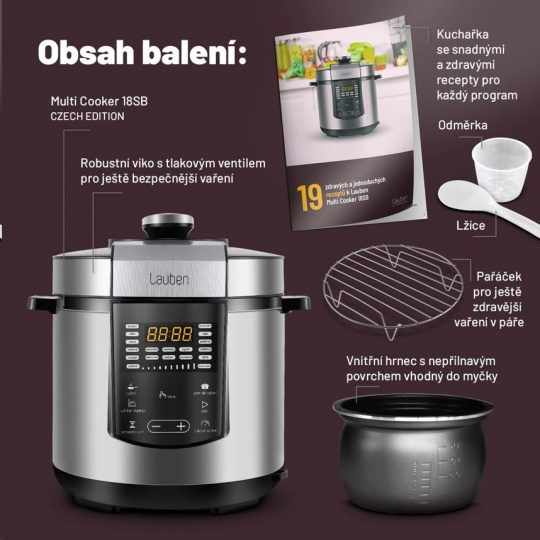 Lauben Multi Cooker 18SB je multifunkční tlakový hrnec, který vám díky 18 přednastaveným programům ušetří v kuchyni spoustu času a námahy. Kromě tlakového hrnce, slow cookeru, nebo rýžovaru, nahradí i vařič vajec, parní hrnec, jogurtovač, nebo ohřívačku. Ušetříte spoustu místa v kuchyni a připravíte širokou paletu pokrmů. Hrnec se snadno ovládá pomocí přehledného dotykového displeje, který je kompletně v češtině. Hlavní nádoba má dostatečnou kapacitu 6 litrů, je z nepřilnavého materiálu a lze mýt v myčce nádobí. Multicooker nabízí i funkci odloženého startu nebo udržování teploty. Navíc je kompaktní, a vy si tak můžete dopřát rychlé, zdravé a bezpečné vaření nejen doma, ale i na chatě nebo na dovolené. Lauben Multi Cooker 18SB je ideálním pomocníkem do kuchyně právě pro vás, pokud chcete mít na talíři vždy perfektní výsledek, ale nechce se vám obětovat hodiny strávené u sporáku, nebo spoustu peněz do kuchyňského vybavení.