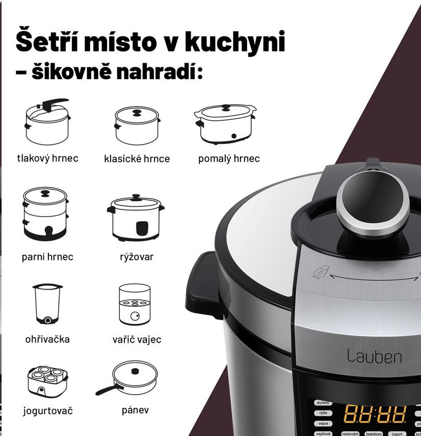 Lauben Multi Cooker 18SB je multifunkční tlakový hrnec, který vám díky 18 přednastaveným programům ušetří v kuchyni spoustu času a námahy. Kromě tlakového hrnce, slow cookeru, nebo rýžovaru, nahradí i vařič vajec, parní hrnec, jogurtovač, nebo ohřívačku. Ušetříte spoustu místa v kuchyni a připravíte širokou paletu pokrmů. Hrnec se snadno ovládá pomocí přehledného dotykového displeje, který je kompletně v češtině. Hlavní nádoba má dostatečnou kapacitu 6 litrů, je z nepřilnavého materiálu a lze mýt v myčce nádobí. Multicooker nabízí i funkci odloženého startu nebo udržování teploty. Navíc je kompaktní, a vy si tak můžete dopřát rychlé, zdravé a bezpečné vaření nejen doma, ale i na chatě nebo na dovolené. Lauben Multi Cooker 18SB je ideálním pomocníkem do kuchyně právě pro vás, pokud chcete mít na talíři vždy perfektní výsledek, ale nechce se vám obětovat hodiny strávené u sporáku, nebo spoustu peněz do kuchyňského vybavení.