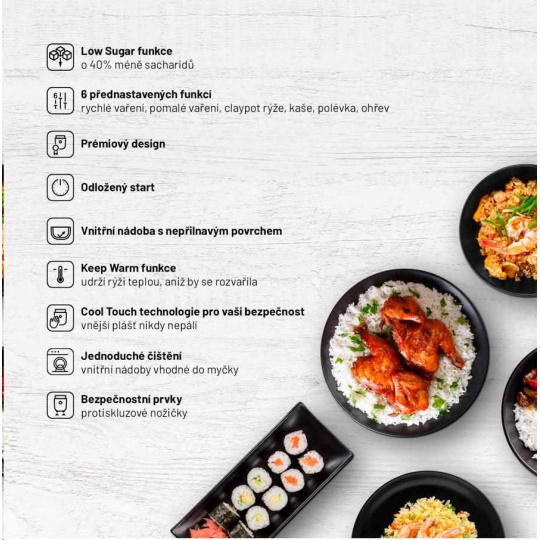 K perfektně uvařené rýži, která je vláčná, a tak akorát na skus, často vede trnitá cesta. S rýžovarem Lauben připravíte jakýkoli druh rýže přesně al dente, stisknutím jednoho tlačítka. Rýží to ale jen začíná. Rýžovar si díky 6 chytrým funkcím poradí i s jinými surovinami. Během několika minut připravíte lahodné polévky, nadýchanou ovesnou kaši nebo luštěniny bohaté na bílkoviny. Samozřejmostí je funkce opětovného ohřevu. Chcete si vychutnat dokonale připravené, zdravé a chutné jídlo? Stačí si na displeji zvolit požadovaný režim a počkat si na bezchybný výsledek.