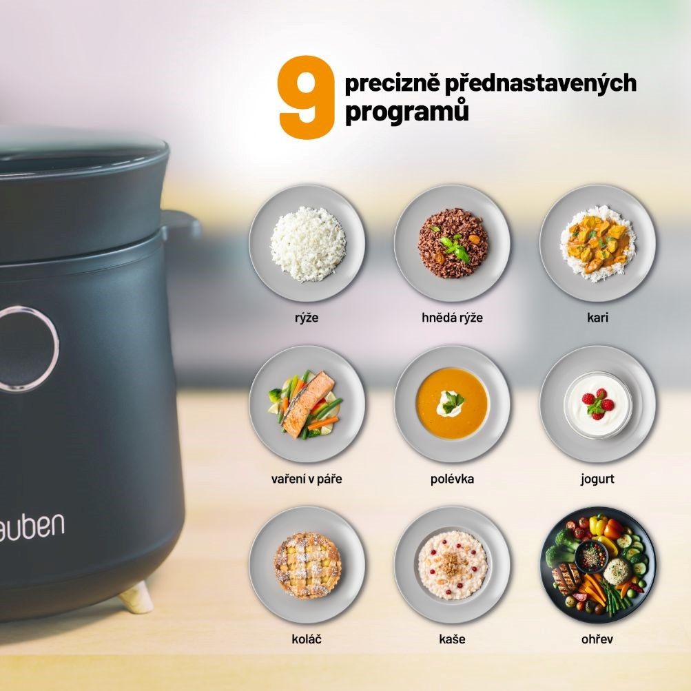 Dopřejte si více času na jiné aktivity a vaření přenechte multifunkčnímu rýžovaru, jehož 9 přednastavených programů si poradí s přípravou nejrůznějších pokrmů. Programy jako rýže, hnědá rýže, polévka, kaše, dort, jogurt, kari, vaření v páře, či ohřev jsou zárukou snadného a rychlého vaření. Prémiový keramický povrch vnitřního hrnce navíc neuvolňuje žádnou nežádoucí pachuť ani aroma, příprava pokrmů je tak zdravější. Pokud chcete svůj životní styl ještě vylepšit, využijte nerezového pařáčku pro dušení v páře. Pařáček je navhrnutý tak, že šťávy z připravovaného jídla nekapou do rýže připravované pod ním.