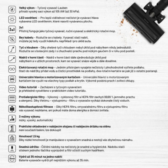 Lauben Stick Vacuum & Mop 3in1 Pet Deluxe 400BC vyniká vysokým sacím výkonem až 105 AW (až 30 kPa) a prémiovým designem, kdy tělo i kovové části a kartáče pokrývá černý matný povrch. Vysavač je možné použít kdekoliv, neboť ke svému provozu nepotřebuje zásuvku a nikde nepřekáží žádné kabely. Sběrnou nádobu lze snadno vysypat při zachování hygieny. Použití vysavače je velmi snadné, pro lepší orientace je však uživateli k dispozici video tutoriál.