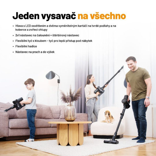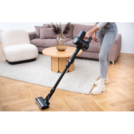 Sběrná nádoba umístěná v horní části přístroje a flexibilní tyč s kloubem dávají možnost snadného úklidu i pod nábytkem či v užších prostorech. Naopak speciálně zakřivený nástavec na prach a do výšek umožňuje pohodlný úklid na skříňkách. Do hůře dostupných míst se dostane flexibilní hadice, a zvláště majitelé domácích mazlíčků ocení hlavici s motorizovanými výměnnými kartáči, kdy antistatický je určen na tvrdé podlahy a další kartáč si poradí s koberci a zvířecími chlupy.