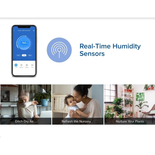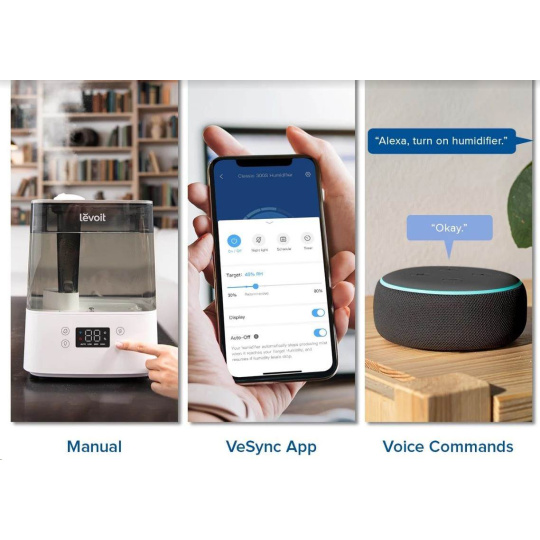 Zvlhčovač vzduchu Levoit Classic300S Smart lze ovládat přímo na přehledném podsvíceném LED displeji nebo také přes aplikaci na chytrých zařízeních Apple nebo Android. Nebo si ho můžete dokonce připojit do svého Smart Home a ovládat hlasem přes Google Assistant nebo Amazon Alexa. Senzor vlhkosti zobrazuje vlhkost v reálném čase a v automatickém režimu tak okamžitě reaguje na změny vlhkosti. Vždy by se mělo jednat o rozmezí mezi 40 % až 60 %. Přes aplikaci si můžete informace kontrolovat nebo si své režimy plánovat.