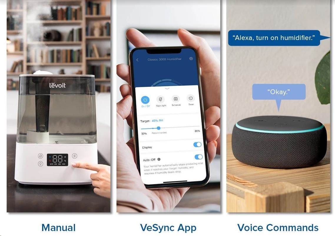 Zvlhčovač vzduchu Levoit Classic300S Smart lze ovládat přímo na přehledném podsvíceném LED displeji nebo také přes aplikaci na chytrých zařízeních Apple nebo Android. Nebo si ho můžete dokonce připojit do svého Smart Home a ovládat hlasem přes Google Assistant nebo Amazon Alexa. Senzor vlhkosti zobrazuje vlhkost v reálném čase a v automatickém režimu tak okamžitě reaguje na změny vlhkosti. Vždy by se mělo jednat o rozmezí mezi 40 % až 60 %. Přes aplikaci si můžete informace kontrolovat nebo si své režimy plánovat.